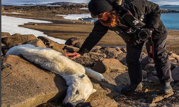 Напротив, това е мъчителна снимка, на която се вижда застрашително отслабнала бяла мечка и повдига дебат за последствията от климатичните промени, коментира изданието "Huffington Post".