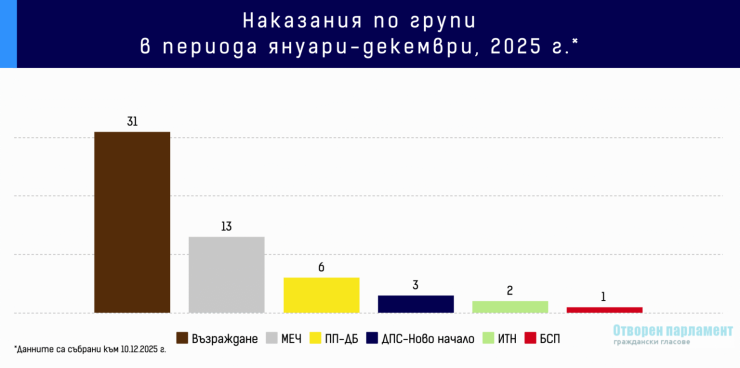 На интернет страницата на Народното събрание има информация за наложените на депутатите дисциплинарни мерки. През тази година най-много наказания са получили от парламентарната група на Възраждане – 28 забележки и 3 порицания, следвани от МЕЧ със 13 забележки. Най-много индивидуални наказания – 9 забележки и едно порицание, има лидерът на Възраждане.