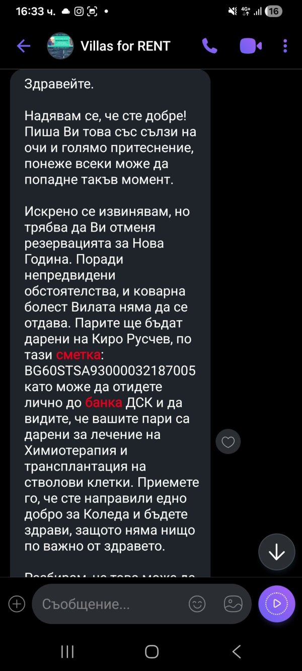 Те са платили капаро, но няколко дни преди настъпването на празниците получават съобщение, че няма да им бъдат върнати парите. "Със сълзи на очи" измамникът обяснява , че няма да може да ги приеме за резервацията за Нова година "поради непредвидени обстоятелства и коварна болест".