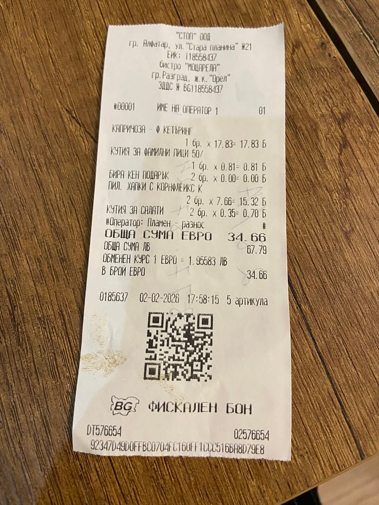 Разград не е познат с високите си възнаграждения и като цяло заплатите там не могат да се сравнят с тези в развитите икономически центрове. Според касовата бележка обаче пица се продава за 18 евро, а две семпли порции филенца, които едва ли са повече от по 150-200 граМа, са оценени на 15 евро.