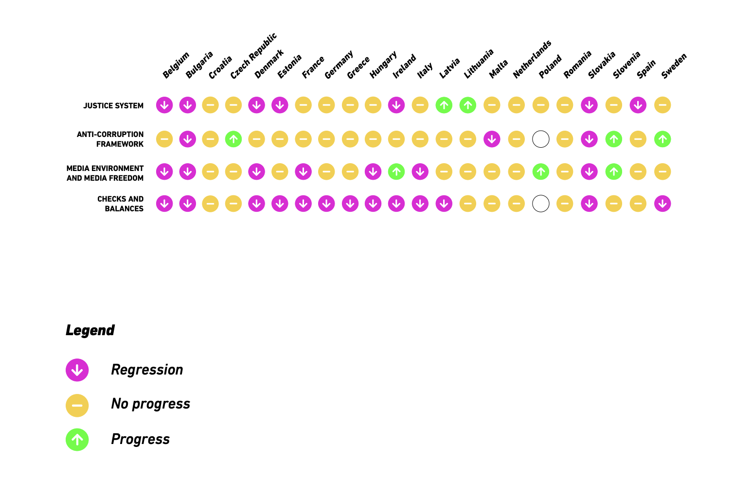 Чехия, Естония, Гърция, Ирландия, Литва, Нидерландия, Румъния и Испания бяха класифицирани като "стагниращи", определени като държави, в които условията на върховенството на закона нито се подобряват, нито се влошават, според доклада от 800 страници.