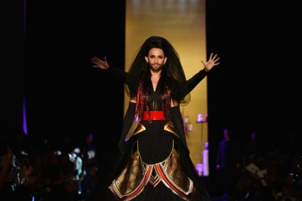 Кончита Вурст направи своя дебют на модния подиум в Париж, облечена с готически тоалет на Жан-Пол Готие, пише "Индипендънт".