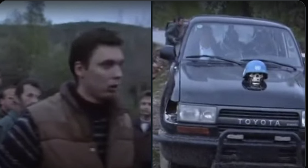 Друго видео показва кола, за която се твърди, че е използвана от Алексич, с човешки череп на предния капак – за който се твърди, че е взет от босненски труп – носещ каска на ООН.