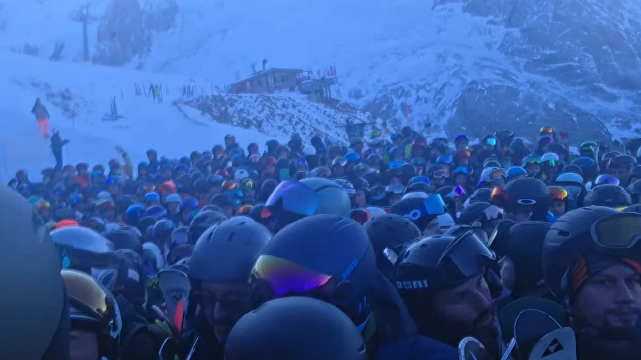 Скиорите в Араба-Мармолада в Доломитите бяха блокирани за повече от час през уикенда, когато пистата, по която се спускаха, се превърна в кал и трева, което наложи затварянето й. Това принуди ентусиастите да се редят на опашка за ски лифт, който да ги свали. Докато се образуваше огромна тълпа, разочаровани скиори се блъскаха и бутаха, за да стигнат до предната част.