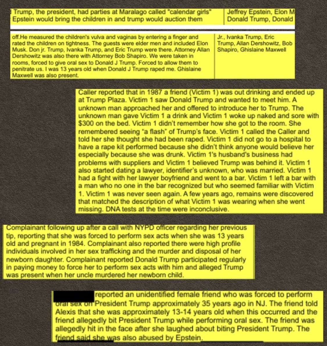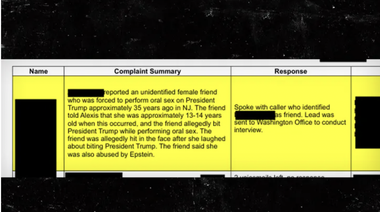 В резюмето на жалбата се казва, че на федералните власти е било казано, че непълнолетното момиче е било на около 13-14 години, когато е възникнал предполагаемият инцидент. Предполагаемата жертва "твърди, че е ухапала президента Тръмп, докато е правила орален секс", а след това "е била ударена в лицето, след като се е засмяла, че е ухапала президента Тръмп".
