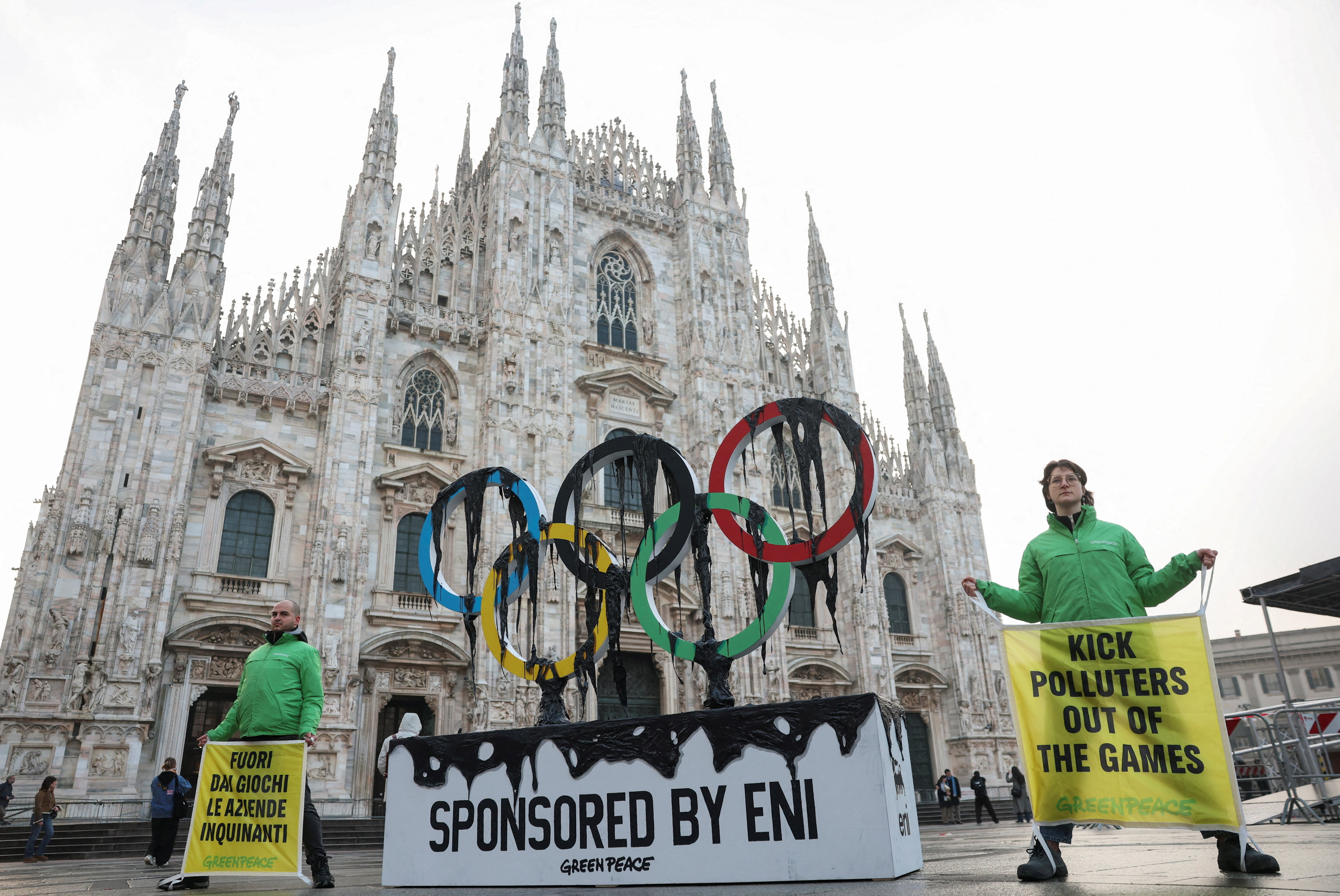 "Изгонете замърсителите от Игрите", гласеше един от банерите пред миланската катедрала в сърцето на града.