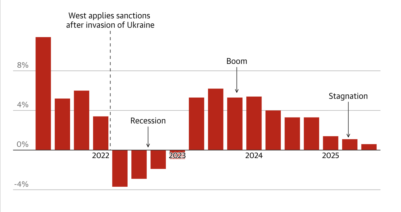 Но по-нататъшни възходи сега изглеждат малко вероятни. През 2026 г. има ясни признаци, че руската икономика най-накрая затъва.