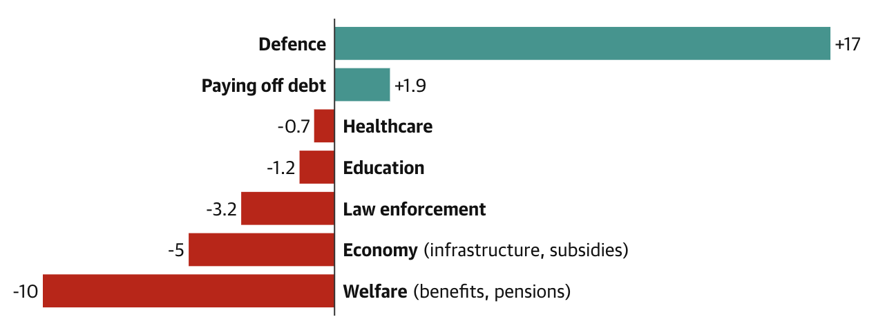 Цената на военната икономика на Русия - процентна промяна в дела на разходите във федералния бюджет, между 2021 и 2025 г.