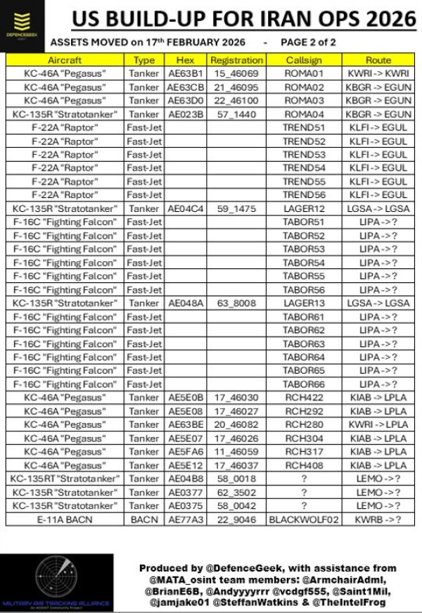 На 17 февруари пък започна най-голямото струпване на американски военни сили след войните в Персийския залив. Само за 48 часа са проследени голям брой американски самолети към европейски и близкоизточни авиобази, включително: