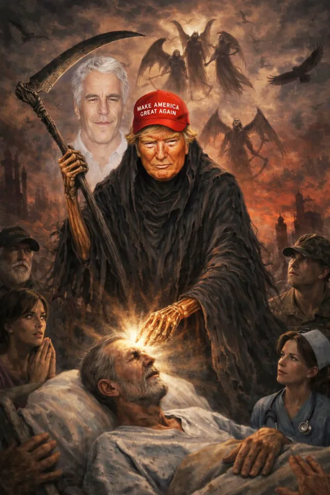 Гавин Нюсъм, демократичният губернатор на Калифорния, който е католик, отговори със собствена редактирана версия на изображението, показващо Тръмп като Мрачния жътвар и Джефри Епстийн на заден план.