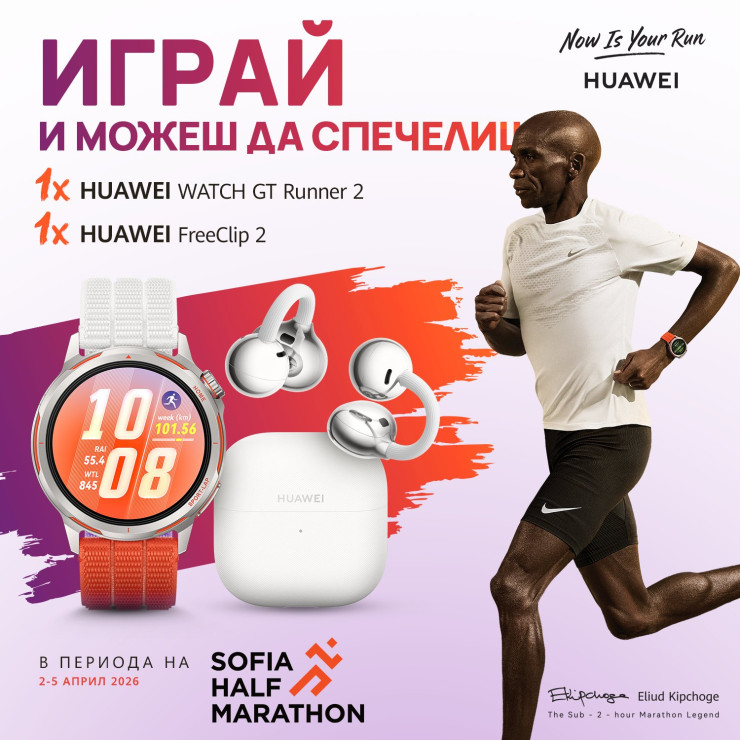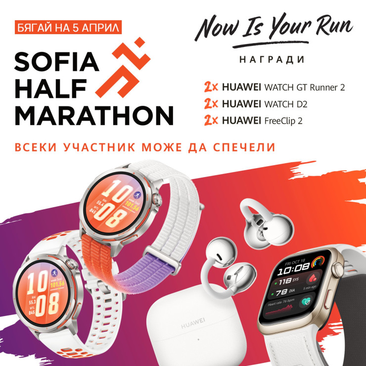По време на Sofia Half Marathon EXPO 2026, което ще се проведе от четвъртък следобед до неделя (2-ри до 5-и април 2026) пред храм-паметника „Св. Александър Невски“, всеки ще може да се запознае на живо с новия Huawei Watch GT Runner 2 и дори да го изпробва. В шатрата на Huawei ще можете да разгледате и тествате и други часовници и продукти на компанията – като серията Huawei Watch GT 6, особено привлекателна за колоездачи, Out-of-Ear слушалките Huawei FreeClip 2, които не запушват ухото, не падат и ви позволяват да не сте напълно изолирани от околната среда при спортове на открито, както и луксозния Huawei Watch Ultimate 2, с който можете да се гмуркате до 100 метра. Пак там ще можете дори да измерите кръвното си налягане с новия Huawei Watch D2, който има вградена въздушна възглавничка в каишката си. Заслужава си да отбележим, че и Huawei Watch D2, и Watch GT Runner 2, и Watch GT 6 Pro поддържат още над сто спортни тренировъчни режима, при това с гласов асистент на български език. Те могат да ви направят и електрокардиограма, наред с измерването на още редица здравни и фитнес показатели. Смартчасовниците на Huawei не са медицински устройва, а са в категория превенция. Не ги ползвайте за диагноза и самолечение, но редовното им следене в домашни условия може да разкрие евентуални проблеми, тенденции и да бъде от незаменима помощ на вашия лекар.