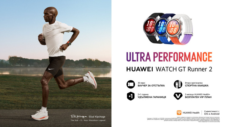 Новият HUAWEI WATCH GT Runner 2, създаден специално за бегачи с различно ниво на подготовка, вече е наличен на българския пазар на препоръчителна цена от 399 евро, а до 15-и май 2026 включително и със стартова отстъпка от 30 евро и други екстри. Сред тях са една година удължена гаранция, която се добавя към стандартната двугодишна гаранция, и 3-месечен абонамент за VIP услугата Huawei Health+. Получавате още 90-дневни безплатни абонаменти за Intervals.icu, Kotcha, RacePace и 60-дневен за Komoot. Освен с тях, новият смартчасовник е съвместим с редица популярни спортни приложения като Strava, URUNN и Naviki.