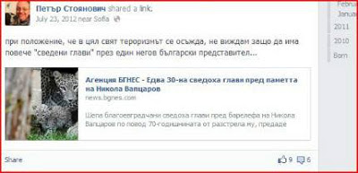 Стоянович коментира журналистически материал, който сам пуска в профила си. Линкът е със заглавие “Едва 30-ина сведоха глави пред паметта на Никола Вапцаров”. Коментарът на новия ни управник над материала гласи следното: “при положение, че в цял свят тероризмът се осъжда, не виждам защо да има повече “сведени глави” пред един негов български представител”. Това определя отношението на изрода Стоянович към поета Никола Вапцаров като недвусмислено – Стоянович смята за “терорист” един от всепризнатите гении на българската литература.