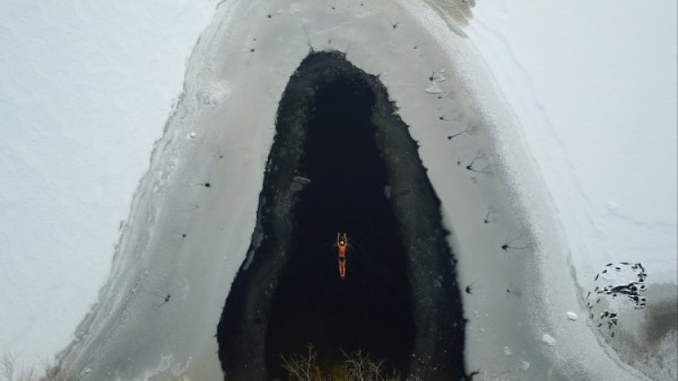 Коледна украса, плуване в замръзнало езеро и красота на лед