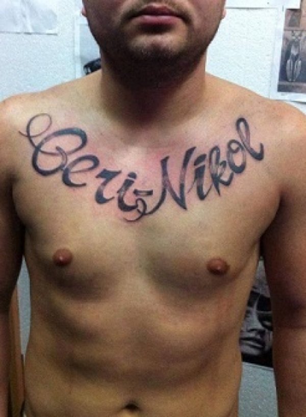 Именно Криско обаче изстреля сред известните Гери-Никол, а манията по пухкавата тийнейджърка надминава границите на нормалното. Някакъв фен се постара да мине в графа "куха лейка", след като си татуира името й на гърдите. Дори с правописна грешка, която само засилва манталитета на фена. С две думи - уникална татуировка! Честито на жената, която си ляга или ще си ляга с този титан на мисълта. Друго си е да положиш морна глава на мъжка гръд, жигосана с "Geri Nikol".