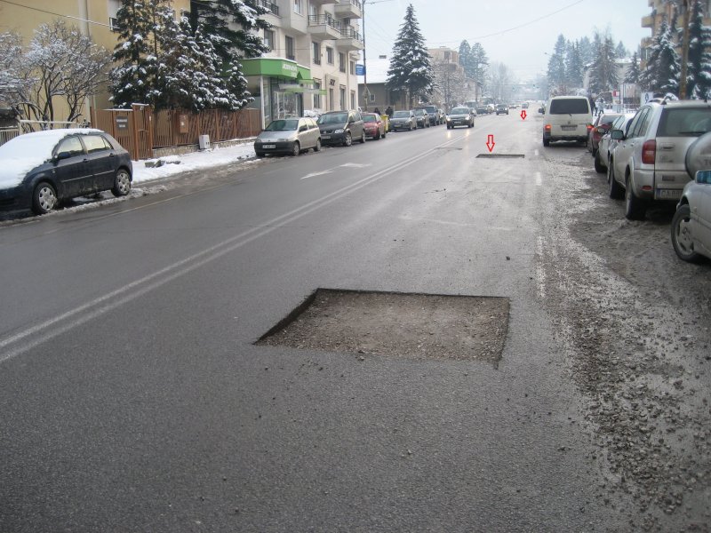 Асфалтът е изрязан още миналата седмица, но и до днес дупките си стоят и стават все по-дълбоки. Това принуждава колите да навлизат в насрещното, което е 100%-ова предпоставка за катастрофи.