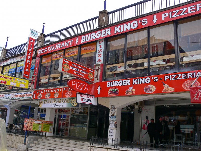 Това е заведение в центъра на град Струга, Македония. Пицарията се казва "Бъргъркинг", като са ползвали и шрифта на известната верига, но както всеки малко по-наблюдателен може да види че на рекламата има и сандвичи на Макдоналдс. :)