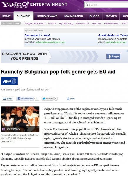 Нямало скандал, всичко било нормално и законно, но вече дори и от Yahoo Сингапур ни се смеят, че с европейски и държавни пари финансираме разпространението на чалгата!