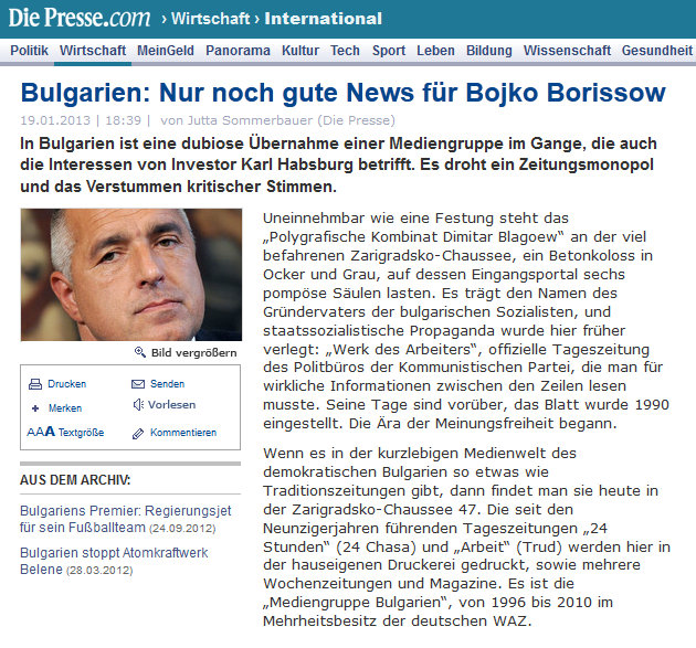Във връзка с покупката на "Труд" и "24 часа" Die Presse пише: "Някои наблюдатели се опасяват, че скоро 98% от българския пазар за печатни медии може да се окаже в ръцете на близката до властта "Нова българска медийна група". Това би била най-голямата концентрация във вестникарската индустрия на ЕС.