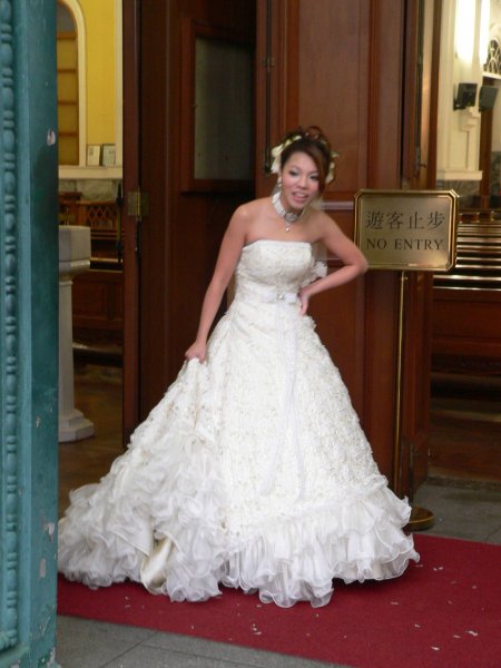 Млада китайска булка наднича от врата на църква в Макао и търси някого. Може би младоженецa :))