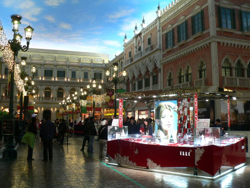 Пл. „Сан Марко“ в казиното „Венецианецът“ в бившата португалска колония Макао. Небето над площада също е изкуствено и денонощно е осветено като при залез слънце.