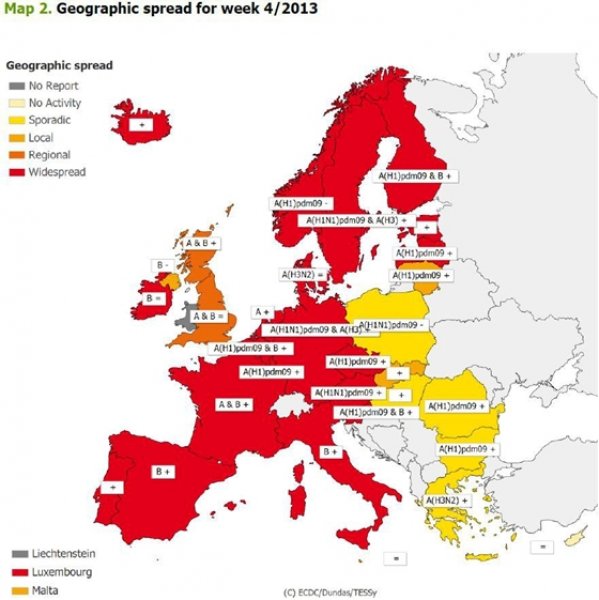 Според картата на грипната епидемия положението в България за сега е отностелно добро. Да внимават тези, които пътуват в западната част на континента, защото там върлува силна грипна епидемия!