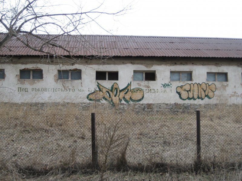 Днес (3.2.2013) снимах тези руини от бивша ТКЗС-арска постройка в с. Ковачевци, област Самоков. На стената има избелял лозунг "Под ръководството на БКП към комунизма!".