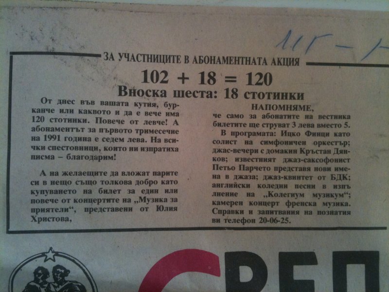 Пример за рекламна кампания за набиране на абонаменти за новата година за вестник Средношколско знаме плюс бонус - билет за концерт на преференциална цена :). Цената на един брой тогава е била 30 ст.