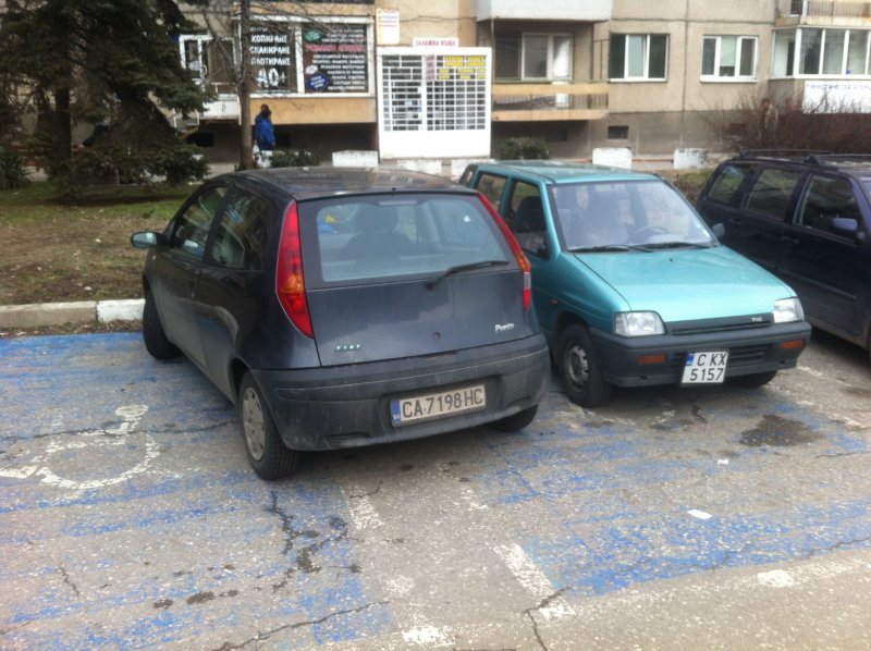 Псевдо инвалиди пред Община Люлин днес - 06.02.2013. И двата автомобила нямаха Инвалиден знак на предния прозорец, въпреки че начина на паркиране говори за много слаби авто умения. Наглост.