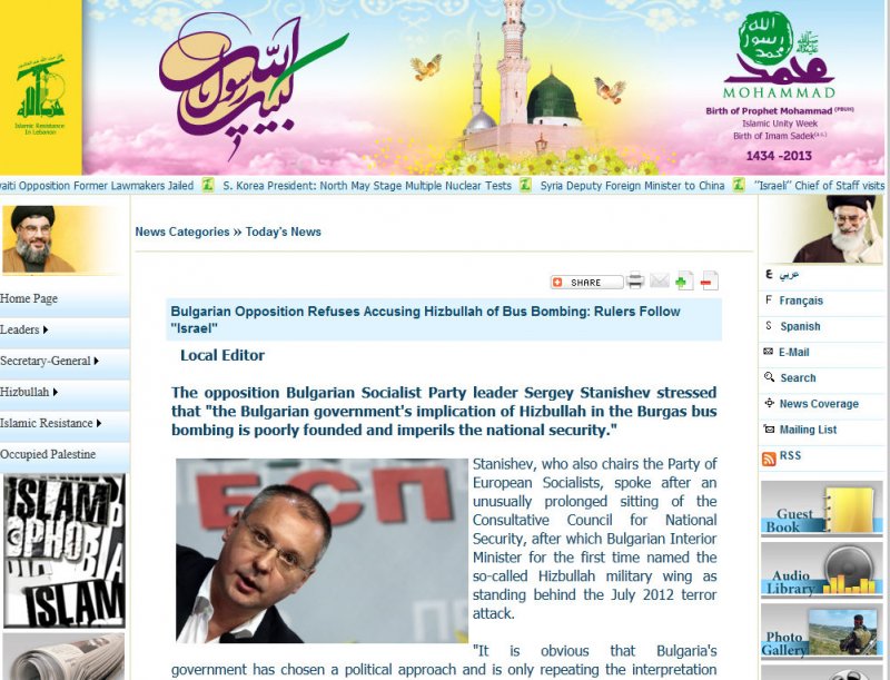 Официалният сайт на Хизбула публикува позициятата на Станишев за атентата в Бургас. В същото време Жозеф Дол, председател на Групата на ЕНП каза: "Изключително съм разтревожен да науча, че лидерът на ПЕС г-н Станишев е заел страната на Хизбула!