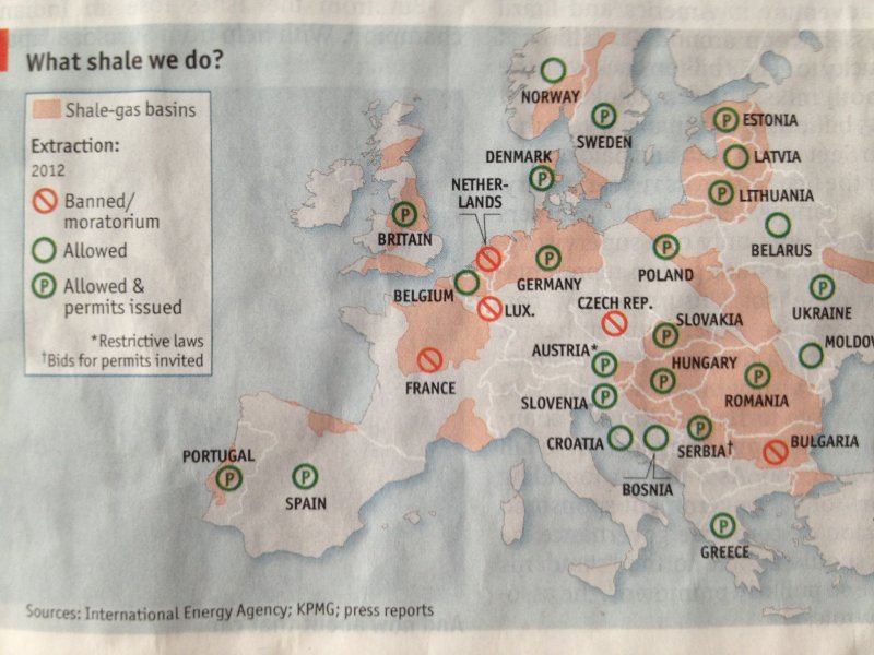 Картата от сп. Економист показва, че 4 страни са наложили забрана, но според схема в Чехия няма залежи, а Франция , Холандия и Люксембург ( град държава) си имат сериозни причини за забрана.