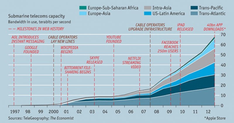 В последният брой на сп. Economist има интересна схема за нарастването на интернет трафикa в света и как влияят най-важните събития . Данните са от TeleGeography.