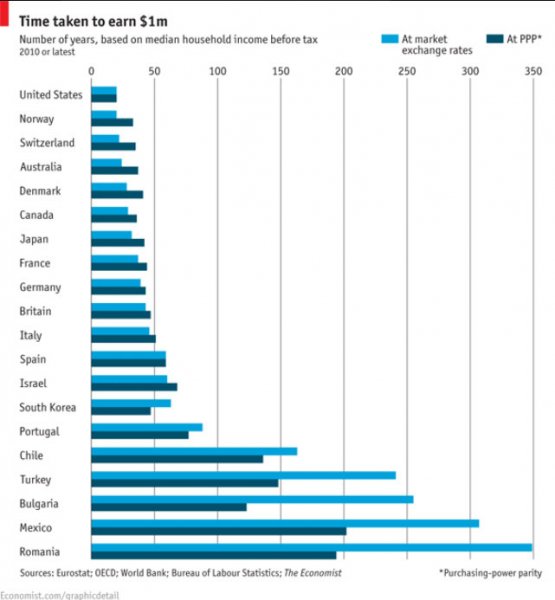 Според графиката на списание „Икономист“ в България са нужни 250 години за да може от заплата човек да стане милионер, ако не я харчи. По Паритетната Покупателна Сопособност, която следи какво може да се купи с дохода, на българите им трябват „само“ 125 години за да купят стоки за 1 милион долара със заплата.