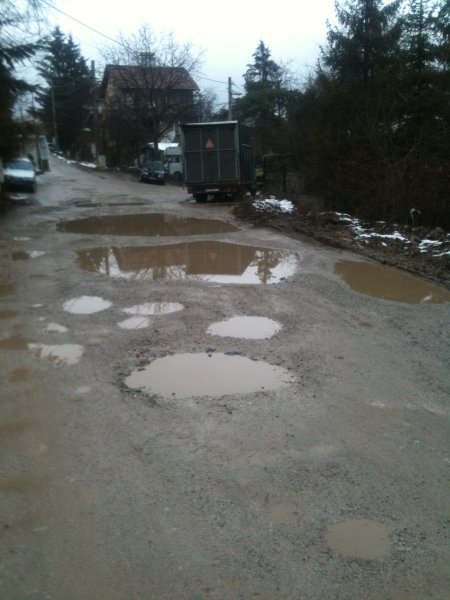 Една от улиците в квартала с дупки, които се увеличават всяка зима. Специално тези малки "езера" са с дълбочина от около 30 см. Улиците в квартала не са поправяни от около 10 години.