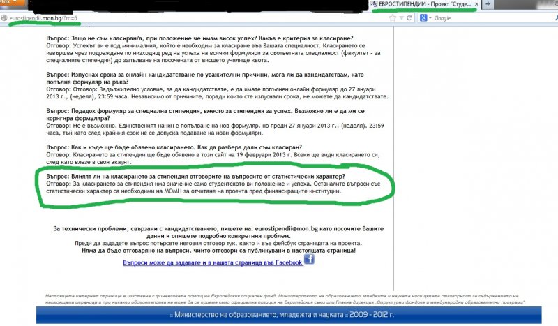 Отговор: За класирането за стипендия има значение само студентското ви положение и успеха. Останалите въпроси със статистически характер са необходими на МОМН за отчитане на проекта пред финансиращите институции." - линк