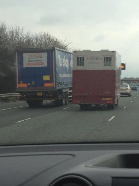 В Англия - камион на Теско (голяма верига супермаркети) и камион превозващ коне! Около проблема с конското месо.