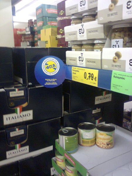 Една от веригите хранителнимагазини, работещи в Гърция, с този син етикет обяви на хората, че няма да си вдига цените. Ще работи както до сега!