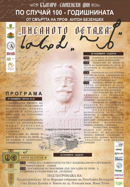 Българо-словенски културни дни "100 години посмъртен живот на проф. Антон Безеншек".От 27 до 29 ноември 2015г. в годината на "Общото европейско минало 2015" ще се проведат Българо-словенски културни празници, включени в културните прояви на Община Пловдив. Те са свързани с отбелязване на „100 години посмъртен живот на проф. Антон Безеншек - основател на стенографията в България, виден публицист, езиковед, свързал житейския си и професионален път с града на тепетата и ще се проведат под патрон.