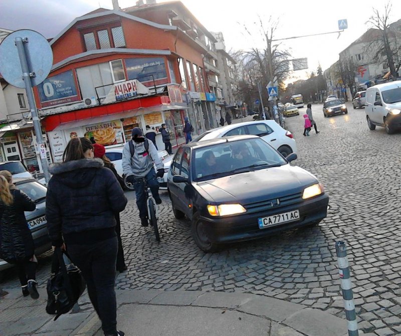 На пазара на ж.к. "Красно село", близо до спирката на 83, 73 и 102 до ул. "Кюстендил", този симпатичен господин беше паркирал за временен престой на аварийки. Беше запушил велоалеята, която минава по тротоара на бул. "Гоце Делчев". Велосипедистите трябваше да заобикалят. Ако се загледате, господинът показва и среден пръст.