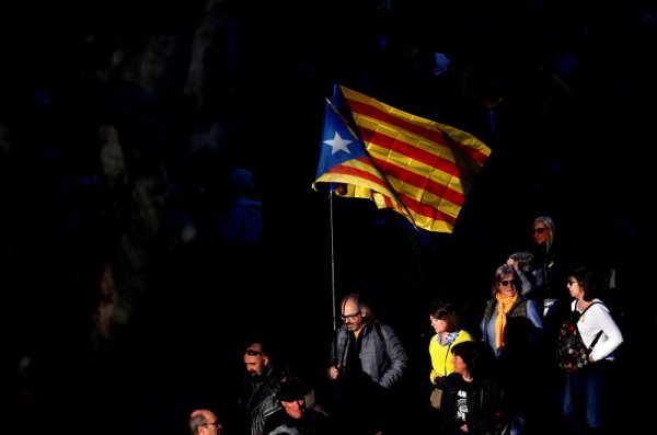 Демонстрантите носеха каталунски синьо-червено-жълти знамена и плакати с надпис "Свобода за политическите затворници" и "Самоопределението не е престъпление".