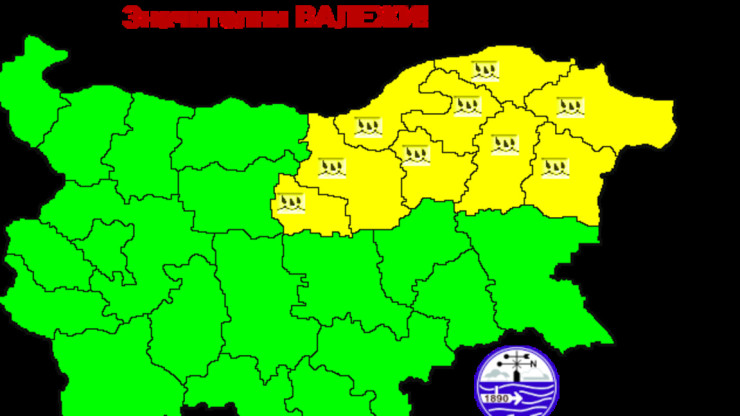 Жълт код за значителни валежи е обявен за 9 области в централна и Североизточна България.