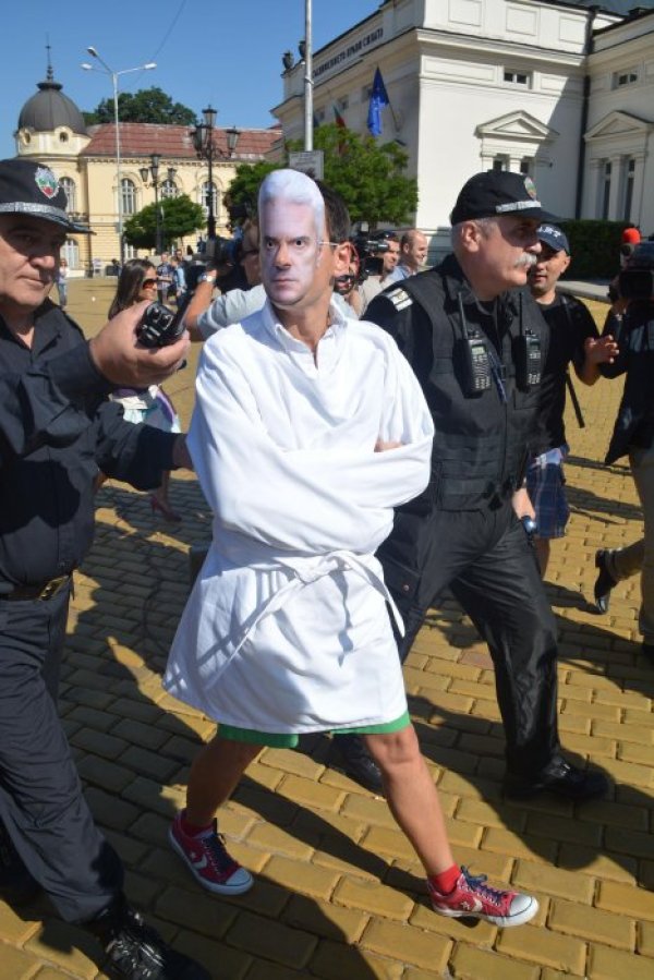 На поредния ден на протест пред парламента Тицин дойде облечен в усмирителна риза и с маска на Волен Сидеров и така премина през металните заграждения пред парадния вход на парламента, което накара полицаите да реагират.