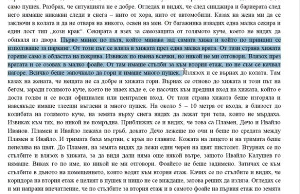 "Първо минах по пътя, който минава зад самата хижа и който се използваше за паркинг. От тази страна хижата гореше само от страната на покрива. Извиках по имена всички, но никой не ми отговори. Насочих се към предния вход на хижата. От тази страна хижата беше изгоряла. Имаше тлеещи въглени и много пушек. На около 5-10 м от входа, в близост до колибата на голямото куче, върху снега, видях да лежат три тела, които не мърдаха. Приближих се и видях, че това са Пламен, Дечо и Ивайло Иванов. Пламен и Ивайло лежаха по гръб, докато Дечо лежеше по очи и беше по средата. И тримата бяха мъртви с кръв до главите. До Пламен на земята видях да лежи един черен на цвят пистолет. Качих се по стълбите и видях, че коридорът на втория етаж е целият в пушек и нищо не се виждаше, затова реших да изляза. Във фоайето на първия етаж по земята имаше разпръснати много гилзи, може би десетки на брой, точно като на филм с голяма престрелка. Гилзите бяха с дължина до 4 см и дебели 7-8 мм и бяха пръснати навсякъде по земята. Според мен гилзите не бяха от патрони за пистолет, а по-дълги и със сигурност по-дебели", сочат показанията на Деян, които разпространи NOVA.