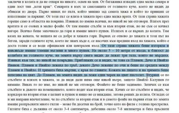 "Първо минах по пътя, който минава зад самата хижа и който се използваше за паркинг. От тази страна хижата гореше само от страната на покрива. Извиках по имена всички, но никой не ми отговори. Насочих се към предния вход на хижата. От тази страна хижата беше изгоряла. Имаше тлеещи въглени и много пушек. На около 5-10 м от входа, в близост до колибата на голямото куче, върху снега, видях да лежат три тела, които не мърдаха. Приближих се и видях, че това са Пламен, Дечо и Ивайло Иванов. Пламен и Ивайло лежаха по гръб, докато Дечо лежеше по очи и беше по средата. И тримата бяха мъртви с кръв до главите. До Пламен на земята видях да лежи един черен на цвят пистолет. Качих се по стълбите и видях, че коридорът на втория етаж е целият в пушек и нищо не се виждаше, затова реших да изляза. Във фоайето на първия етаж по земята имаше разпръснати много гилзи, може би десетки на брой, точно като на филм с голяма престрелка. Гилзите бяха с дължина до 4 см и дебели 7-8 мм и бяха пръснати навсякъде по земята. Според мен гилзите не бяха от патрони за пистолет, а по-дълги и със сигурност по-дебели", сочат показанията на Деян, които разпространи NOVA.