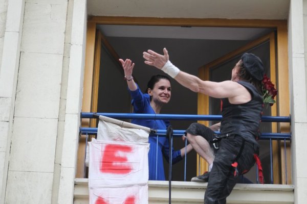 Френският танцьор и катерач Антоан Льо Менестрел изпълни впечатляващ пърформанс по фасадите на знакови сгради на площад "Славейков" в София.