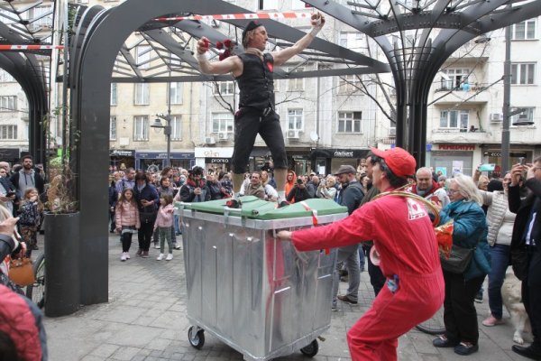 Френският танцьор и катерач Антоан Льо Менестрел изпълни впечатляващ пърформанс по фасадите на знакови сгради на площад "Славейков" в София.