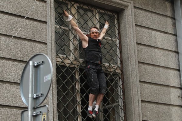 Френският танцьор и катерач Антоан Льо Менестрел изпълни впечатляващ пърформанс по фасадите на знакови сгради на площад "Славейков" в София.