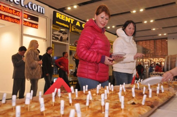 С 10-метрова баница с късмети, вино и българско хоро бяха поздравени пътниците, заминаващи и пристигащи от Москва днес на Летище Бургас.