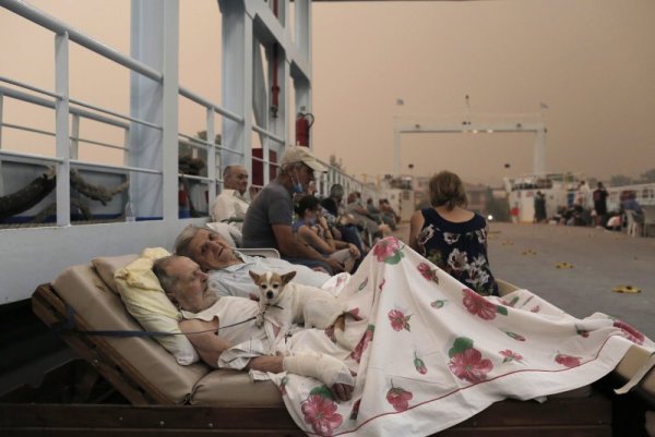 Докато 260 пожарникари от Гърция и още 200 от Украйна и Румъния се бориха с пламъците, младите хора пренесяха възрастни и немощни жители на безопасно място по пясъка. Други избягаха от селата си пеша за една нощ сред ужасяващите гледки. Като сцена от апокалиптичен филм бе евакуацията на няколко стотин души, отдалечаващи се от Евбея на ферибот, докато пейзажът зад тях е потънал в пламъци.
